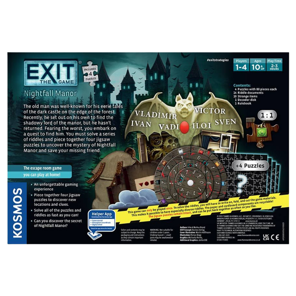 The old man was well-known for his eerie tales of the dark castle on the edge of the forest. Recently, he set out on his own to find the shadowy lord of the manor, but he hasn't returned. Fearing the worst, you embark on a quest to find him. You must solve a series of riddles and piece together four jigsaw puzzles to uncover the mystery of Nightfall Manor and save your missing friend.