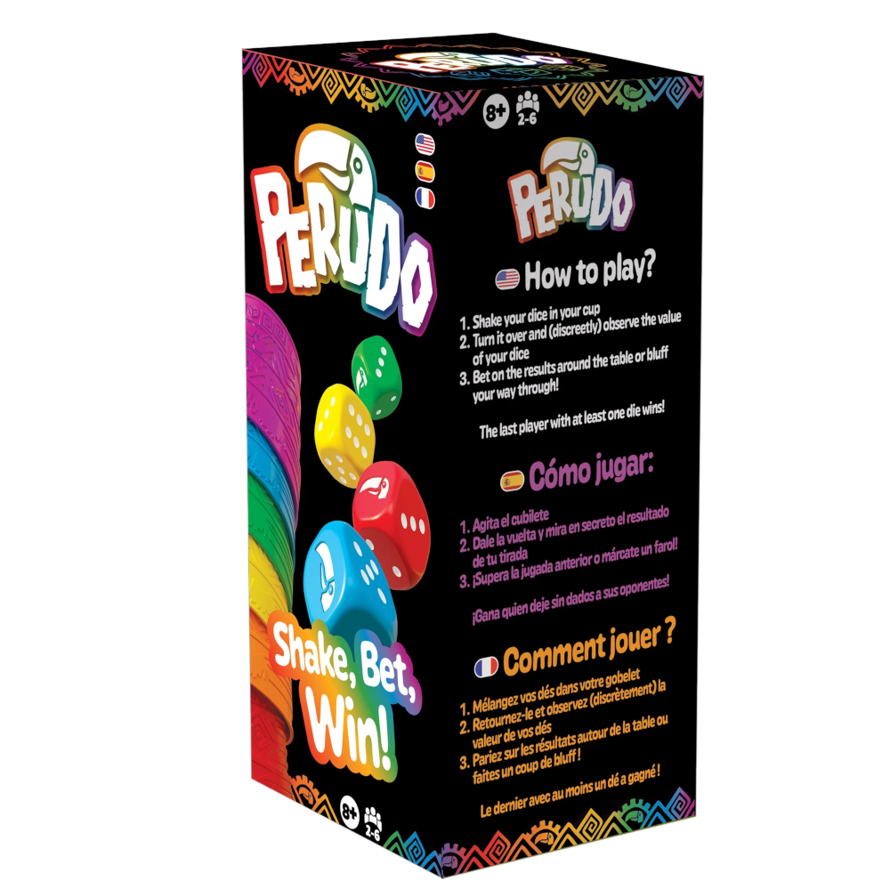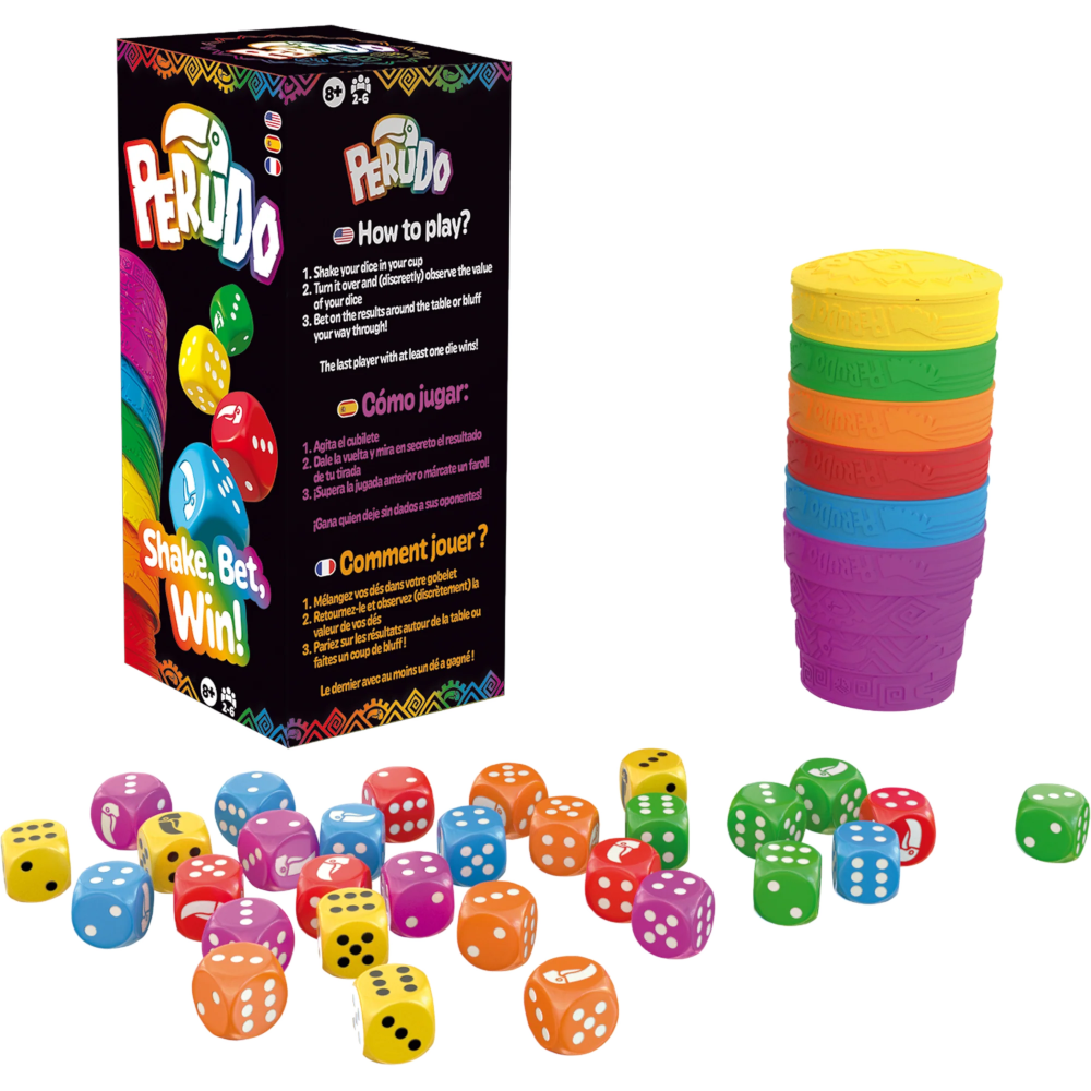 In this game of betting and bluff, each player gets a color-coordinated set of a cup and five dice. Roll the dice, bet on the outcome and be the best bluffer to win!
